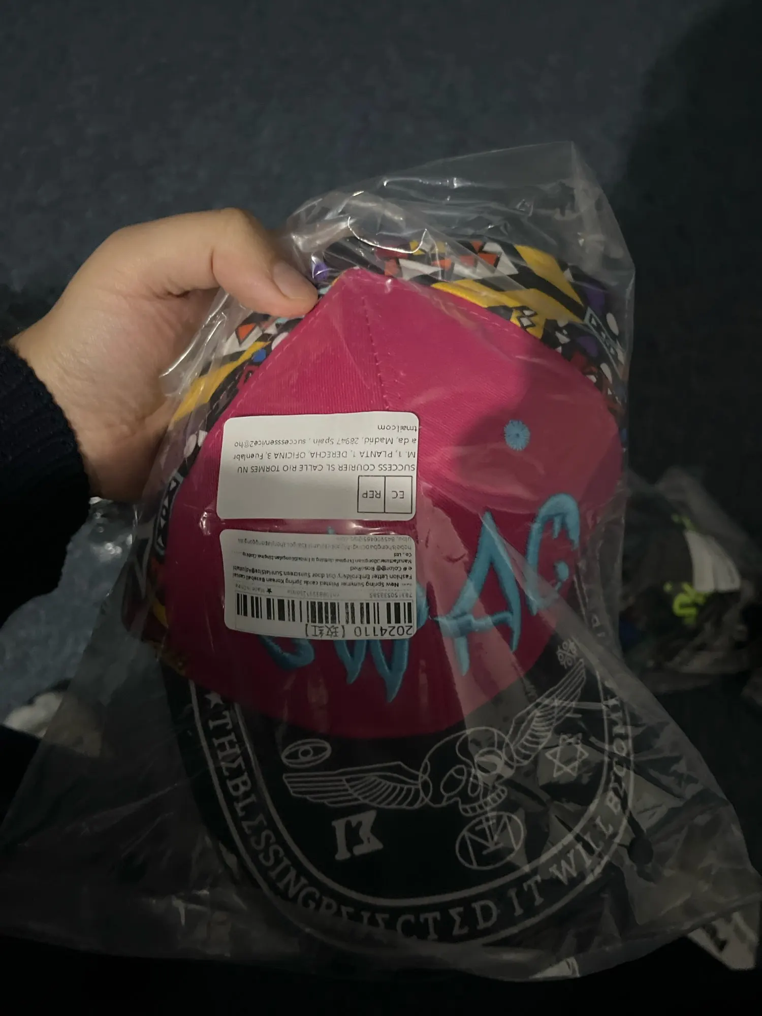 El embalaje es básico, bolsa de plástico y relleno de plástico delgado para evitar que la parte delantera del sombrero se desmorone.